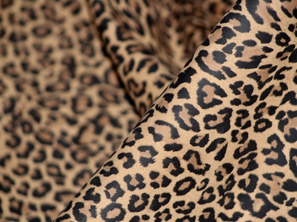 Texturized leopard print on bovine split suede,Underlined pattern contradiction by a smooth finish and rubbery hand feel.